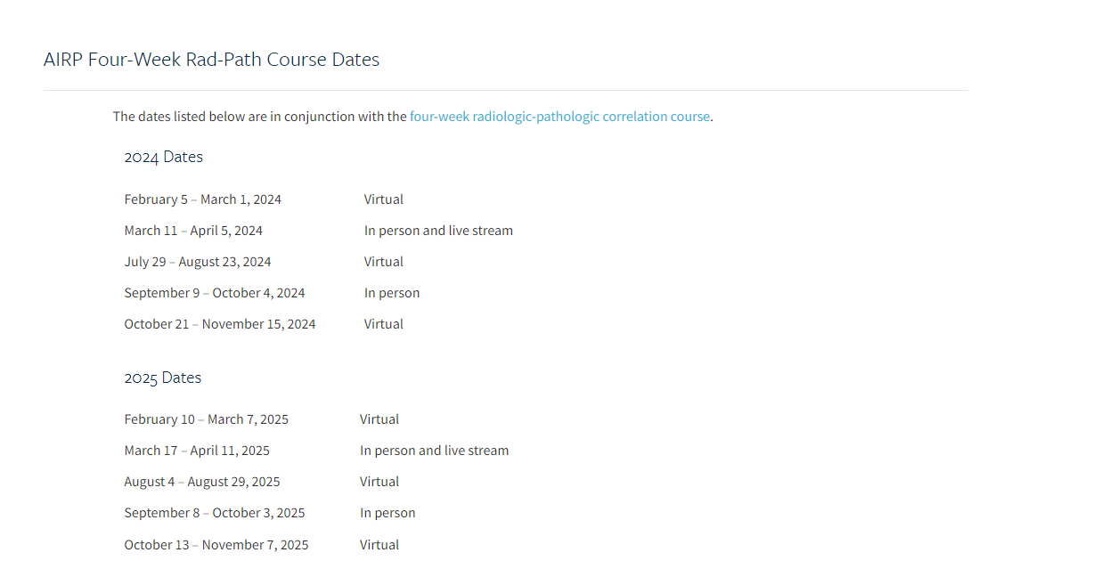 Las observaciones se realizan en el Instituto de Patología Radiológica del ACR (AIRP), en varios hospitales y clínicas relacionadas. Estas instalaciones se encuentran en el área de Washington, DC. Los observadores aceptados pasan dos meses en observación clínica. Cuatro semanas de la rotación se dedicarán a conferencias en el curso de correlación radiológica-patológica del AIRP.