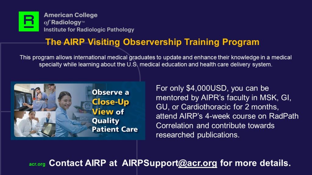 El Programa de Capacitación para Observadores en el AIRP permite a radiólogos o radiólogos en formación no estadounidenses mejorar su conocimiento en imagen genitourinaria, gastrointestinal, cardiotorácica o musculoesquelética, mientras aprenden sobre el sistema de educación médica y la prestación de atención médica en EE.UU.