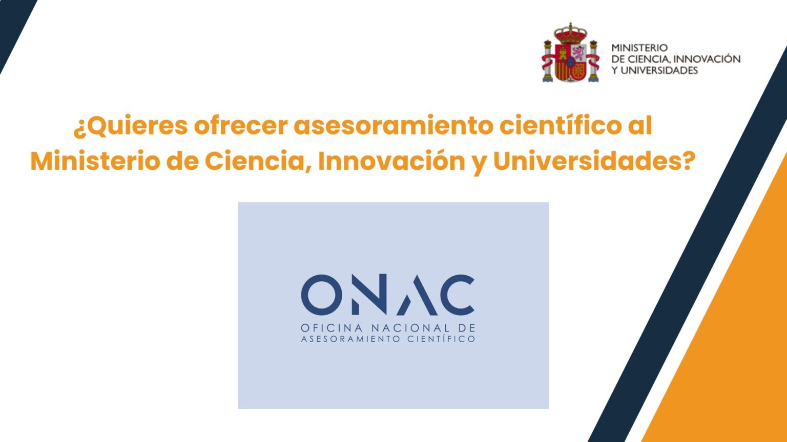 La ONAC (Oficina Nacional de asesoramiento Científico, como órgano directivo del Gobierno de España encargado de establecer mecanismos institucionales para reforzar el papel de conocimiento científico en la toma de decisiones del Gobierno de España) realiza un llamado de interés del Ministerio de Ciencia para cubrir 22 puestos de asesoramiento científico en los ministerios: