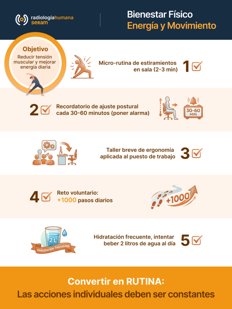 Desde la iniciativa Radiología Humana de la SERAM queremos contribuir a integrar este enfoque en la práctica diaria, con propuestas realistas y aplicables. En nuestra web encontrarás el desarrollo completo del plan de autocuidado.