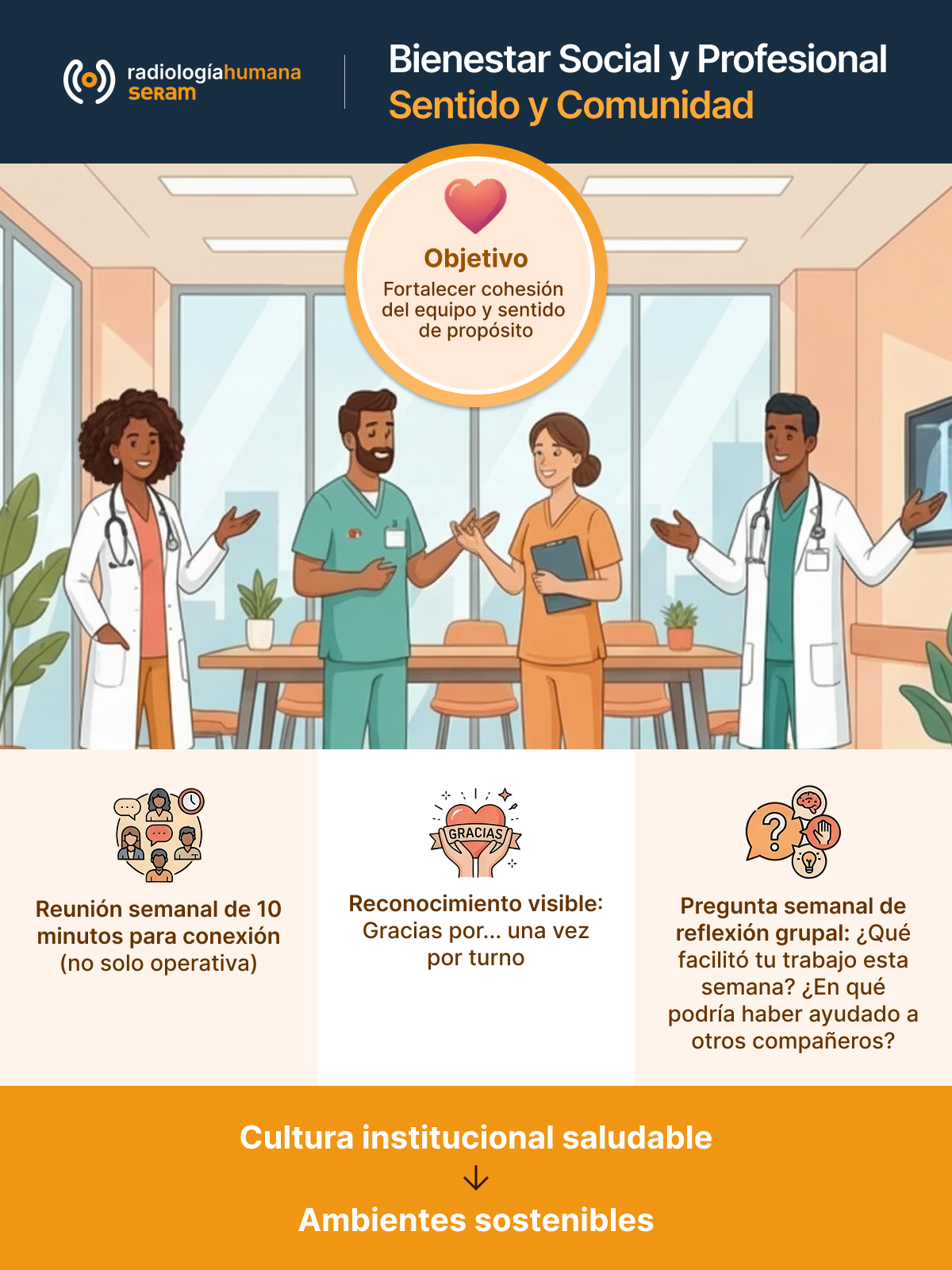 Desde la iniciativa Radiología Humana de la SERAM queremos contribuir a integrar este enfoque en la práctica diaria, con propuestas realistas y aplicables. En nuestra web encontrarás el desarrollo completo del plan de autocuidado.
