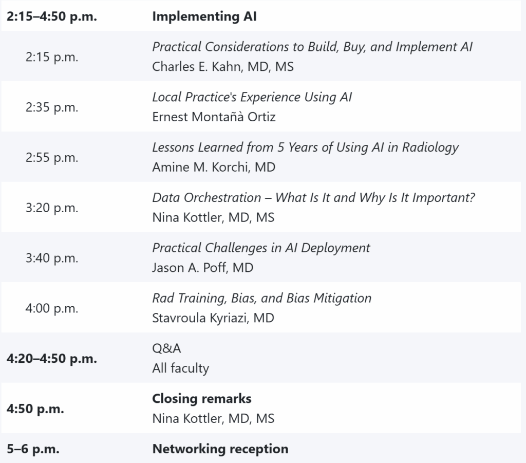 Por la tarde han dado continuidad las charlas interactivas que han cerrado la primera jornada del RSNA Spotlight Course “Radiology Reimagined — Advancing Clinical Practice through AI Innovation”, celebrada en Barcelona con la colaboración de la SERAM.