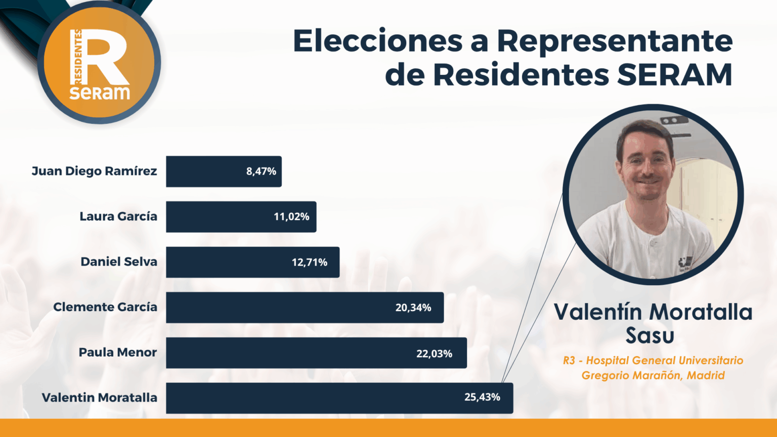 Valentín Moratalla Sasu ha sido elegido nuevo representante de residentes SERAM con un 25,43% de los votos. Es R3 en el Hospital General Universitario Gregorio Marañón (Madrid) y forma parte también del Club Bibliográfico SERAM. Graduado en Medicina por la Universidad Autónoma de Madrid (2016–2022), Valentín afronta este nuevo rol como una oportunidad para reforzar la voz del colectivo residente y contribuir activamente al crecimiento de la comunidad radiológica.